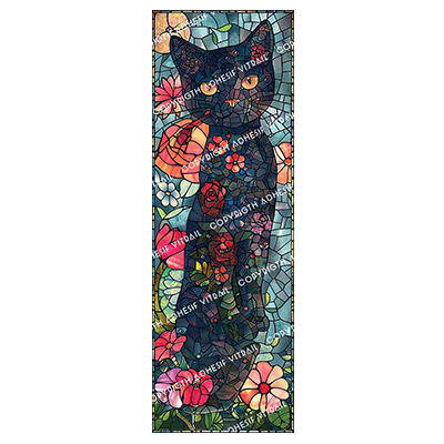 Adhésif vitrail d'une Illustration raffinée d’un chat noir orné de motifs floraux délicats sur son pelage.