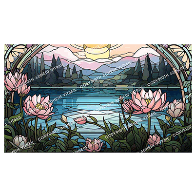 Adhésif vitrail représentant un paysage apaisant avec des fleurs de nénuphar délicates.