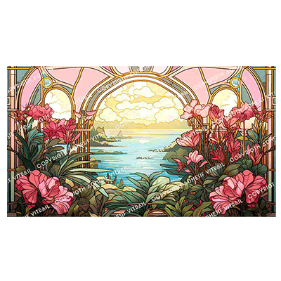 Adhésif vitrail au décor paysager élégant, mêlant plantes et fleurs dans un subtil camaïeu de roses et de verts.