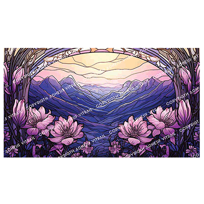 Adhésif vitrail au décor floral raffiné, mariant des teintes délicates de rose et de mauve.