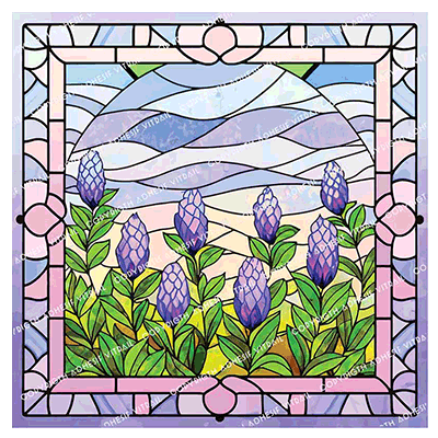 Adhésif vitrail au décor floral délicat, inspiré par les jacinthes et lavandes aux tons doux de rose et violet.