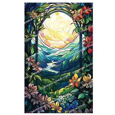 Transformez votre intérieur en un véritable tableau de lumière avec cet adhésif de style vitrail au paysage onirique. À travers une arche élégante, un panorama de montagnes verdoyantes et de vallées lumineuses se déploie, baigné par un soleil doré qui semble éveiller la nature. Les teintes vibrantes et les lignes fluides s’entrelacent pour composer une scène à la fois apaisante et spectaculaire.