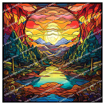 Ce modèle spectaculaire illustre un soleil rayonnant sur une rivière qui serpente entre forêts et montagnes.