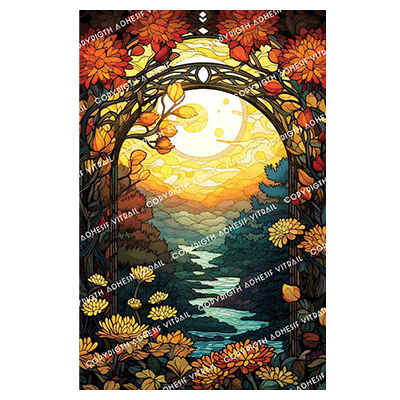 Ce modèle revisite avec élégance l’esthétique traditionnelle du vitrail à travers un graphisme contemporain riche en détails. Une arche tressée de branches encadre un paysage flamboyant : un soleil doré illumine des collines verdoyantes et une rivière sinueuse, dans une harmonie parfaite de lignes stylisées et de couleurs chaudes.