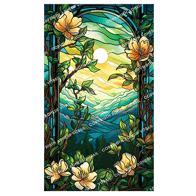 Inspiré des vitraux traditionnels, ce modèle revisité dévoile une scène poétique baignée de lumière. À travers une arche élancée, un soleil éclatant illumine un paysage de montagnes aux lignes douces, dans une harmonie de verts profonds, de turquoises vibrants et de reflets dorés.