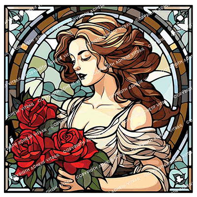 Plongez dans une atmosphère poétique avec cet adhésif vitrail autocollant d’inspiration romantique, représentant une figure féminine délicate tenant un bouquet de roses rouges.