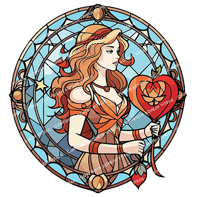 Elle tient entre ses mains un cœur stylisé orné d’un motif floral, symbole de douceur et de romantisme. Sa silhouette, encadrée par une structure circulaire richement détaillée, évoque les vitraux anciens tout en s’inscrivant dans une interprétation graphique moderne.